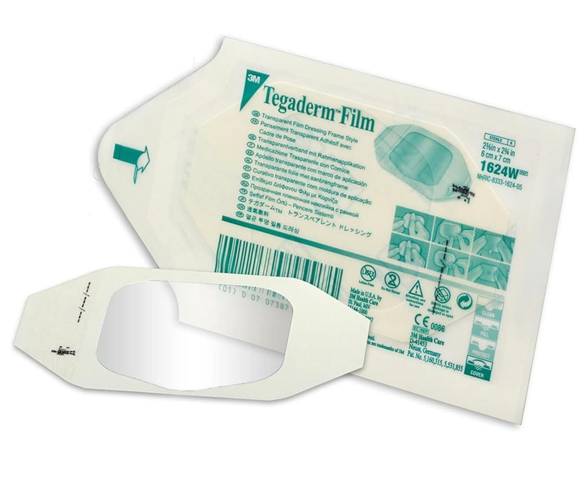 Tegaderm Transparent Dressing is a sterile, waterproof, clear, thin film dressing. Can be applied over I.V. devices, clean skin or wounds, and provides a breathable bacterial barrier to outside contaminants. 2-3/8 inch x 2-3/4 inch (6cm x 7cm) Transparent Film Dressing Frame Style.Â
