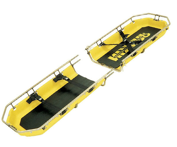 The same construction as JSA-200. Designed to rescue injured persons from locations where lengthy foot travel is mandatory. The stretcher breaks into two halves which can be back-packed to the point of rescue and assembled in seconds. Positive-locking quick-release pins secure two halves together. Four straps are standard.