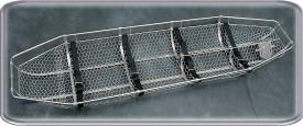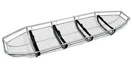 Nylon web straps at chest, abdomen, thigh, and calf. Adjustable footrests for vertical lifting. Frame is 5/8" steel tubing; cross braces and runners 3/16" x 3/4" flat steel. Basket is 18 gauge, 1" hexagon mesh netting.