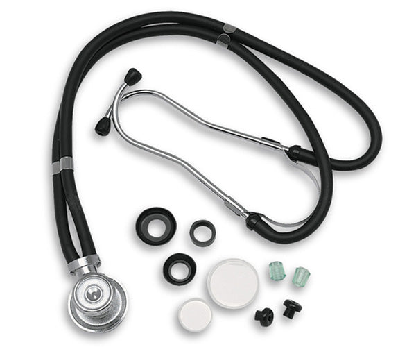 The most popular stethoscope on the market today, the MTR Sprague Rappaport Stethoscope offers unlimited flexibility while maintaining superior acoustic qualities. The interchangeable chestpiece accessories allow for custom user design. Heavy-walled 22" tubing blocks out extraneous sounds even in the noisiest conditions. Comes complete with accessory pouch.